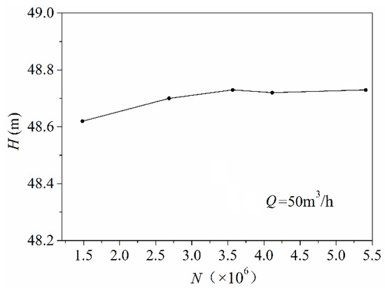 Since the SA-DES model does not require any wall functions, the mesh that is close to the wall surface must be designed to accurately predict the hydrodynamic force; hence, the high-aspect-ratio cells near the wall have been generated [27]. The mesh of the fluid domain was generated using ICEM-CFD (17.0, ANSYS, Pittsburgh, PA, USA, 2016) as its advantage of a well-adapted and efficient hexahedral grid was applied for meshing, as shown in Figure 4. The length of the inlet and outlet pipes was extended to eliminate the influence of back flow. The grid convergence and grid independence tests were performed, and the results showed that the head–flow rate curve became stable as the elements of mesh over 3,612,548, as shown in Figure 5. Therefore, the final element numbers of the volute, impeller, and draft tube were 865,260, 3,007,154, and 243,200, respectively.