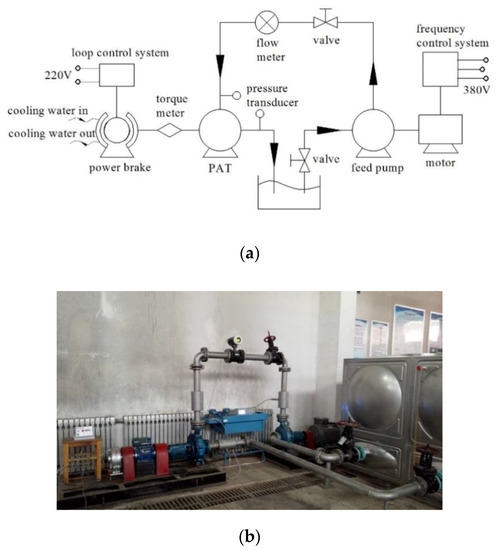 In this section, the numerical method was validated by the experimental results. A test rig was established for the hydraulic performance experiment of PAT. The test rig was composed by water supply, PAT, and energy dissipation sections as shown in Figure 7. A feed pump was installed to provide the head and flow rate for PAT. A magnetic power brake was equipped to balance the output power, and a loop control system was used to adjust the torque of output shaft. A flow meter was equipped at the inlet pipe of PAT for measuring the flow rate, and two pressure transducers were installed at the PAT inlet and outlet for measuring pressure. For measuring the torque and rotational speed of PAT, a torque meter was set at shaft. The head, flow rate, power and efficiency of PAT could be obtained after all parameters were measured.