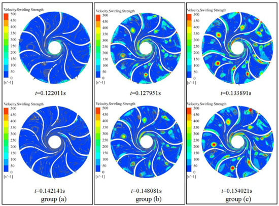 The swirling strength contour of detected vortices during one rotating cycle was displayed in Figure 9. It can be seen that although the vortex size and position were stable, the swirling strength changed with rotation of the impeller. In the first half of the rotating cycle, the swirling strength was minimum (0~50 s−1) at 0.122011 s, intensified to maximum (450~500 s−1) at 0.133891 s, and weakened to minimum (0~50 s−1) again at 0.142141 s. The revolution of the vortex swirling strength in the second half of the cycle was the same as the first half. The vortices information was extremely similar at 0.122011 s and 0.142141 s, 0.127951 s and 0.148081 s, as well as 0.133891 s and 0.154021 s. It can be found that the time steps of each working point are 0.2 s approximately for the three groups (group a, b, and c, as shown in Figure 9), that is half the time of per rotating cycle (0.4 s) for PAT. In other words, the swirling strength of the vortex develops periodically with two times the rotating frequency.