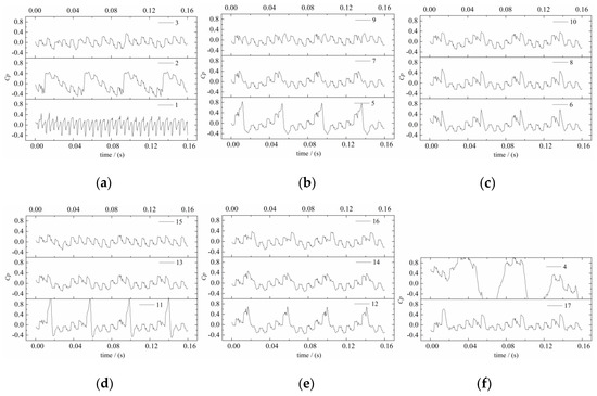 Pressure fluctuation coefficient with time. (a) Points 1, 2, 3; (b)Points 5, 7, 9; (c)Points 4, 6, 8; (d)Points 11, 13, 15; (e)Points 12, 14, 16; (f)Points 4, 17.