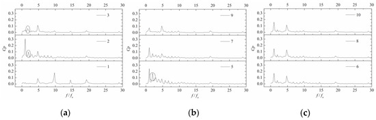 It can be seen that the leading pressure fluctuation of the monitoring points occurred at 1 f/fn, 5 f/fn, 10 f/fn, and 20 f/fn. Obviously, this related to the rotor–stator interaction. Pressure fluctuation at 1 f/fn caused by the rotor–tongue interaction, at 5 f/fn, 10 f/fn, 20 f/fn caused by blade–tongue interaction (the impeller equipped with 5 long blades and 5 short blades). Therefore, the main factor of pressure fluctuation was the rotor–stator interaction.