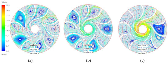 Streamline at radial plane of impeller. (a) 0.6 Qd; (b) 1.0 Qd; (c) 1.6 Qd.