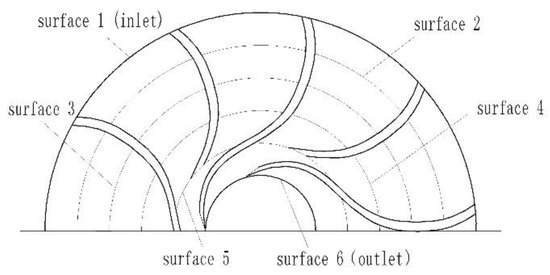 As the axial vortices were generated, power losses were raised inevitably. To study the power losses caused by vortices, the flow domain in the impeller was divided into six zones (Figure 16), and power losses of each zone were calculated.