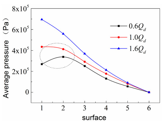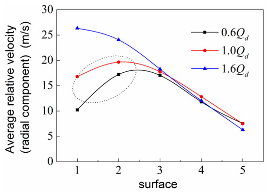 Flow distortion have been detected in the impeller that was caused by axial vortices, where a wake region has been found near the impeller inlet, it was significant especially for 0.6 Qd and 1.0 Qd (Qd is design flow rate), as shown in Figure 12. As a consequence, a low-pressure zone appeared near the impeller inlet, and the relative velocity no longer distributed alongside the blade surfaces. In order to reveal the effect of axial vortices on performance characteristics of PAT, six monitoring cylindrical surfaces in the impeller were created as shown in Figure 13. Figure 14 was the distribution of the average relative velocity (radial component) in the impeller, and Figure 15 was the average pressure at each cylindrical surface. It can be seen that the average relative velocity (radial component) and pressure curves decreased gradually along the flow direction in the impeller channels for 1.6 Qd; however, a local decline of the curves appeared at surface 1 and 2 for 0.6 Qd and 1.0 Qd. As shown in Figure 12, the streamline of 1.6 Qd was uniform, and very tiny axial vortices were detected in the flow channels. However, large axial vortices can be found near the impeller inlet at 0.6 Qd and 1.0 Qd; this was much more serious for low flow rates. It can be seen from Figure 12 that the region from surface 1 to surface 3 was worse affected by axial vortices for the low flow rates that reasonably responded to the local decline of the average relative velocity and pressure.
