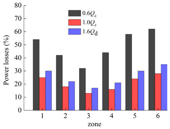 Figure 17 presented the power losses of each zone for 0.6 Qd, 1.0 Qd, 1.6 Qd, respectively. It can be seen that the power losses of zone 1 and 2 (the inlet region of the impeller) were higher distinctly than zone 3 and 4. As mentioned earlier, the large axial vortices occurred in this region usually, and caused the reduction in energy conversion of PAT. What calls for special attention was that the power losses of zone 5 and 6 were higher than zone 3 and 4 as well, which was related to the vortices in the draft tube to a great extent, and it deserved further research in the future.