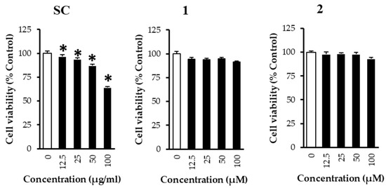 The MDA-MB-231 and MCF-7 cells (ATCC, Manassas, VA, USA) were maintained and cultured in Roswell Park Memorial Institute medium (RPMI 1640; Corning, Manassas, VA, USA) supplemented with 10% fetal bovine serum (FBS; Atlas, Fort Collins, CO, USA), 100 µg/mL streptomycin, and 100 units/mL penicillin (Gibco, Grand Island, NY, USA). The growth conditions were set at 37 °C, 5% CO2 and 95% relative humidity. The stock solution of SC extract (100 mg/mL) and 9 compounds (100 mM) were prepared in dimethyl sulfoxide (DMSO; Santa Cruz Biotechnology, Dallas, TX, USA). A 1 mM stock solution of cisplatin was made in autoclaved distilled water. The final percentage of DMSO was controlled less than 1‰, which showed no cytotoxicity on tested cell lines compared to non-treated cells.
