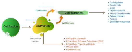 First steps in microalgae production, from cultivation to harvesting and cell disruption, for extraction or recovery of intracellular and extracellular components [,].