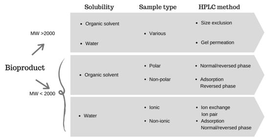 The chromatographic methods use the differences in the characteristics of molecules in a mixture to separate them, according to properties such as adsorption (liquid–solid), partition (liquid–solid), affinity and molecular weights. There are several types of chromatography and the effectiveness of each one will depend on the nature of the molecule to be separated [].
