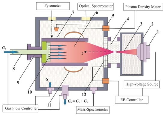 Under typical conditions of the EBP generation (medium pressure 0.1 < Pm < 10 kPa and moderate EB power Nb < 1 kW), the plasma was strongly non-equilibrium and cold. The EBP was produced in the EBPR key subsystems of which are presented in Figure 1.