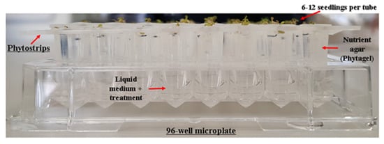 The effect of the EBP-produced COS on plant root growth was studied using Arabidopsis thaliana (Col-0), a popular model organism in plant biology. The scheme of the experiment is presented in Figure 3 and was based on a plant phenotyping platform published previously []. Surface sterilized Arabidopsis seeds were placed in Phytostrips (4titude Ltd., Wotton, UK) inserted into 96-well plates at a concentration of 6 to 12 seeds per well with Phytagel™ BioReagent (Sigma-Aldrich, Hamburg, Germany) and incubated at 4 °C overnight. Then the seeds were moved to the growth chamber for 3 days at temperature of 22/21 °C (day/night; 16/8 h) and 70% relative humidity under light intensity of 120 µmol/(m2×s). On the fourth day, 150 μL of two different aqueous COS solutions produced after 5 and 10 min of EBP treatment were added to each well at two different concentrations (0.25 and 1 mg/mL, respectively). The equal volume of distilled water was added to control plants. Three days later, the impact of the EBP-produced COS on the total root growth was assessed by measuring the longest primary root in each tube.