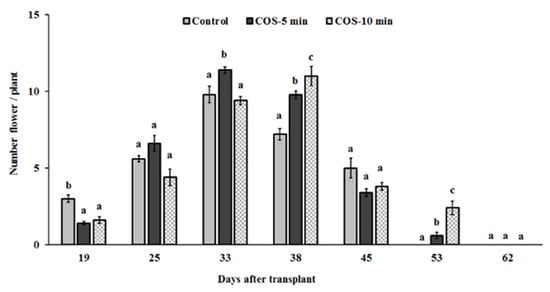 The effect of the EBP-produced COS on flower number in tomato plants (cv. Micro-Tom). Treatments were applied three times after transplanting by foliar spray at 0.25 mg/mL (1, 25, and 37 days, respectively). The data are presented as Means ± SE. The same letters within the same time point indicate that there are no statistically significant differences between the data. For example, for day 33, a statistically significant increase (p ≤ 0.05, Fisher’s LSD test) is observed only for COS-5 min (marked as b), and for control and COS-10 (marked as a) there are no statistically significant differences.