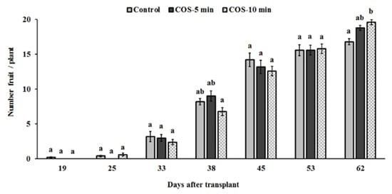 The stimulating effect of the EBP-COS on the increase in the fruits number was statistically confirmed at the later growth stage. Moreover, 62 days after the transplant, tomato plants treated with the COS produced after 5 and 10 min of the EBP treatment yielded 11.9% and 16.7% more fruits, respectively (Figure 5). The effect of COS produced in the EBP is comparable with that of COS obtained by means of other techniques [,,,,,]. As a result of applying a water-soluble formulation of chitosan oligosaccharides, four times at 0.25 mg/mL, the marketable fruit yield of the industrial tomato cultivar “H9661” increased between 9% and 19%, with respect to the control []. Moreover, application of 500 mg/mL water-soluble commercial chitosan in vitro resulted in improved acclimatization of potato plantlets in the greenhouse and significantly increased the average tuber number by 36% compared to the untreated plants [].