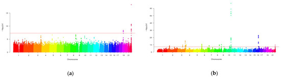 - Turley, P.; Walters, R.K.; Maghzian, O.; Okbay, A.; Lee, J.J.; Fontana, M.A.; Nguyen-Viet, T.A.; Wedow, R.; Zacher, M.; Furlotte, N.A.; et al. Multi-trait analysis of genome-wide association summary statistics using MTAG. Nat. Genet. 2018, 50, 229–237. [Google Scholar] [CrossRef]