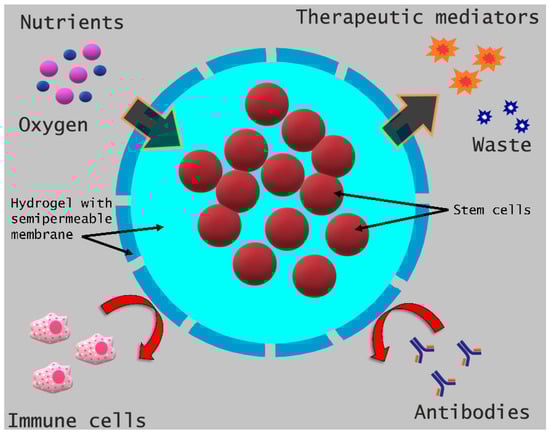 Cell encapsulation provides a semi-permeable barrier that allows stem cells to absorb nutrients from the environment and grow, offering their functional characteristics to tissues, while it simultaneously protects them from various aggravating factors and grants them specific biological advantages (Figure 3).