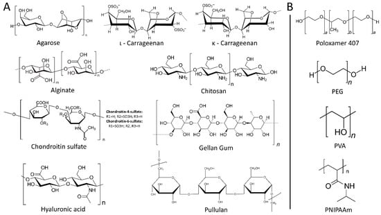 Chemical structures of natural (A) and synthetic (B) hydrogels.