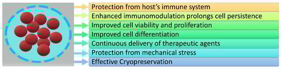 Encapsulation provides a semi-permeable barrier surrounding the cell, which, on the one hand, impedes the recognition of the implanted cell by the host’s immune system and its subsequent elimination and, on the other hand, allows the encapsulated cell to have access to nutrients and to maintain its functional potential, mainly through the secretion of soluble mediators that help in repairing the target tissue (Figure 1) [11].