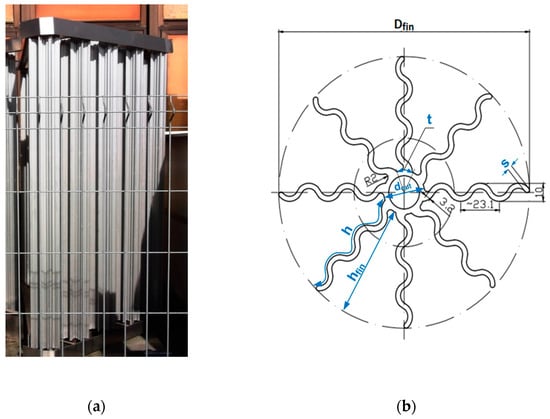 Evaporators of heat pumps operating in natural air flow conditions are usually made as freely arranged systems of (usually) vertical, longitudinally finned tubes (Figure 1) [,]. The conditions for heat exchange on the air side may be variable. The air flow can be implemented along the tubes or across the tube axis. The heat exchange can be either free convection or mixed convection. Natural air flow conditions and operation under severe frost conditions imply a high degree of development of the external surface of the evaporator (Afin/Ain ≈ 16) []. In the case of free convection, the thermal efficiency of the evaporator decreases significantly. In the case of mixed convection, the thermal efficiency may be at least twice as high as in the case of free convection [].