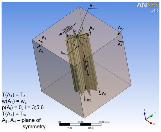 The heat transfer process between the finned tube and the outside air, including the aforementioned equations, was modelled using the finite volume method and Ansys-Fluent software. Modelling of the mixed convection process, the fin shape and the transverse direction of air flow required the model to be prepared in 3D space. A hexagonal grid of 9 × 106 elements was generated for the geometric model corresponding to the actual dimensions of the finned tube. In the overlapping areas of boundary conditions and the area of air contact with the exchanger, the grid was thickened. During the calculation, the required accuracy of the calculations was obtained for the conjugate convergence criterion set at a value of 10−6. The boundary conditions adopted for the calculation are shown in Figure 2.