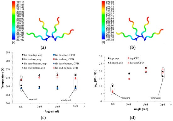 A full validation of the calculation model based on own experimental results [] including verification of temperature distribution, local values of heat transfer coefficients and fin efficiency was presented in [,]. Verification of the adopted calculation model included the range of Reynolds numbers (0 < Re = < 6300, wamax = 2.3 ms−1). The calculation model adopted for mixed convection, with a k-ω SST turbulence model, is more suited to the transient flow range, which can particularly occur on the leeward side of the profile. It should not be excluded that for very large Reynolds numbers, the k-ε model may also be an adequate model of turbulence. The results of the calculations confirmed qualitative changes in temperature distribution and heat transfer coefficients on the perimeter and along the tube height. The calculated local distributions of temperature and heat transfer coefficient were compared with the experimental values measured at two tube heights lbott = 0.2 m and ltop = 1.6 m []. Figure 3 shows sample results of verification of the calculation model obtained for mixed convection (frontal air velocity wa = 2.3 ms−1, average temperature difference between air temperature and fin base temperature ). The results of the calculations presented in Figure 3c,d show that under the considered conditions of mixed convection, the forced convection process dominated. Similar values of heat transfer coefficients were observed in the lower and upper part of the tube. The average deviations between the calculated and measured values of temperatures, heat transfer coefficients and fin efficiency were in the following ranges: <0; 2.6%> for temperature distribution, <−11%; 23%> for local values of heat transfer coefficients and <0; 6%> for fin efficiency. The reason for the discrepancy between the experimental and simulation results may be the fact that the condensation effect on the surface of the exchanger tubes is omitted from the simulation calculations. Any conditions under which the experimental research was conducted were characterised by low relative air humidity (φ = 30–40%) and minimal frosting of the exchanger [].