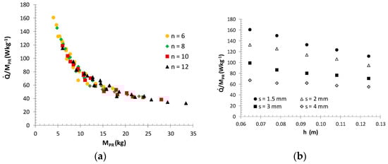 Figure 4a shows the dominant influence of the exchanger mass on the value of the objective function under consideration and that the highest values of the G2 function are obtained for the case of n = 6 fins mounted on the tube. Figure 4b shows the effect of the thickness and height of the fin on the values analysed for the objective function . In this case, it should be noted that the minimum number of short and thin fins allows for a minimum mass and at the same time promotes the formation of flow disturbances at the entire height of the fins, improving the process of heat exchange on the air side. Thus, within the considered range of variability of the arguments (Equation (4)), the maximum value of the objective function G2max = 160 Wkg−1 was reached at the boundaries of the range for: n = 6, h = 0.065 m, s = 0.0015 m. For these geometric parameters, the efficiency of a single exchanger tube was 648 W, with the mass of the fins MPR = 4.02 kg.
