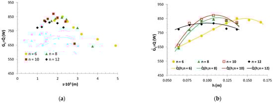 In Figure 5b, the continuous line marks the course of the function form (Equation (9)) and points  corresponding to the results of simulation calculations. The relative differences between the efficiency values obtained were small, up to ±3.5%. Optimal values of geometric parameters h, s, for a certain number of fins, determined as a maximum of function (Equation (9)) are given in Table 2. The extremes values for function (Equation (9)) in the considered function domain were determined algebraically. The maximum thermal efficiency of a single heat pump evaporator tube (evaporator) of  W was achieved for the geometric parameters of the tube (n, h, s) of 10, 0.11 m, 1.80 mm, respectively. The optimisation results indicate that in case of finned surfaces, the optimal geometric parameters are moderate fin heights as well as their moderate numbers.