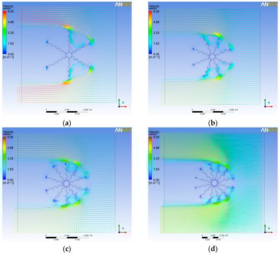 Distribution of air flow rate in the cross-section of the model L = 1 m: (a) n = 6; (b) n = 8; (c) n = 10; (d) n = 12.