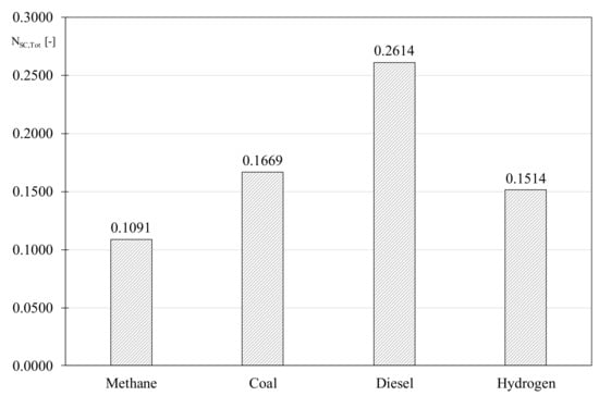 In Table 4, the values of the partial correction factors f of Equation (8) referring to the considered pollutants and global correction factor F of Equation (9) associated with the combustion process of the considered fuel are listed. For the latter, it must be highlighted that a high value does not imply a minor pollutants emission, because these are weighted by the available combustion heat. As a consequence, the highest value of F allows to determine the best compromise between available heat and correspondent emission of pollutants in the external environment. Results show that the lack of CO2 emissions for hydrogen combustion allows the attainment of the best score. Despite the presence of other pollutants, coal and diesel benefit of their lower heating value, therefore the correction factor is prevalently influenced by the CO2 mass concentration. An intermediate result was obtained for natural gas, because of the compromise between better thermodynamic properties and emission of pollutants when compared with the other fossil fuels.