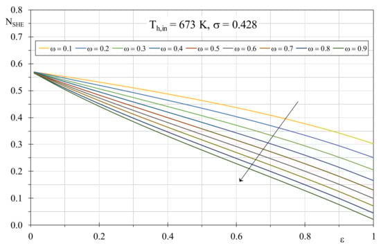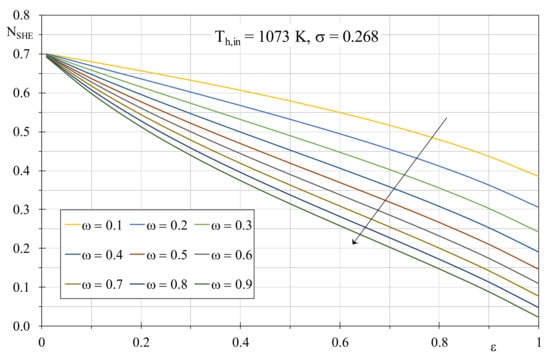 Obviously, the EGN related to the heat exchanger decreases with the efficiency and the thermal capacity ratio growth: in both cases, this trend is justified by the limitation of the temperature difference among the fluids that, in turn, determines a reduction of the thermal exchange irreversibilities. In particular, when ω increases, an augment of the mass flow rate of the hot fluid can be associated and, at parity of transferred thermal power, the correspondent reduction of the difference temperature between inlet and outlet produces a limited entropy production, in accordance with Equation (12). To confirm this, in Figure 3, the EGN trends are showed with a dimensionless temperature factor of 0.268, the latter achievable by setting the inlet hot and the cold fluid temperatures to 800 °C and 15 °C, respectively. Again, the evident increment of the EGN is due to the large temperature difference between the fluids that determines a consequent irreversibility growth. Another significant aspect concerns the change in the thermal capacity ratio, that in this case produces more visible deviances for the EGN, that tends to reduce with the ω increment.