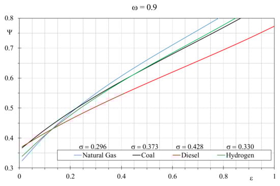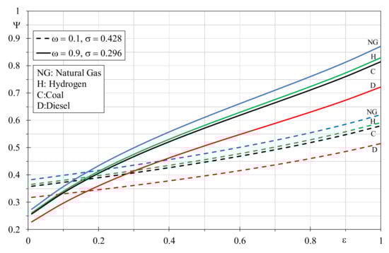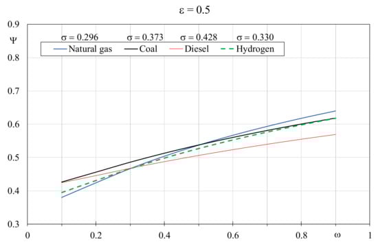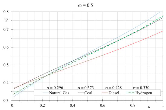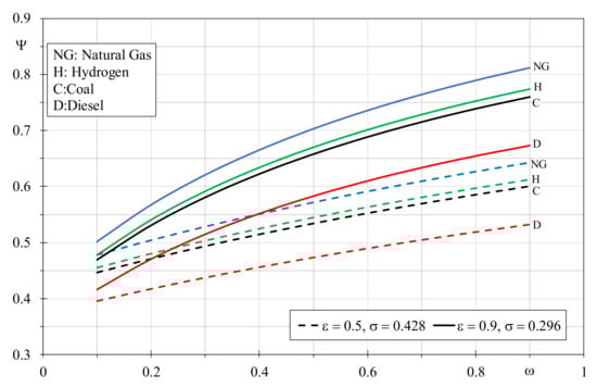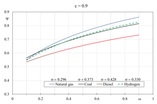 Figure 7 and Figure 8 show the EQI determined by varying the thermal capacity ratio and the dimensionless temperature factor, by setting the boiler efficiency to 0.9 and 0.5, respectively. With the efficiency growth, a wide variation of the EQI values can be observed; it can be appreciated that the role of coal as alternative fuel improves especially in presence of limited thermal capacity ratio values and when the boiler efficiency is low. Conversely, despite that the more favorable dimensionless temperature factor was associated, Diesel is not indicated with high boiler efficiency, independently from the thermal capacity ratio value. In particular, Figure 7 shows that natural gas is again the recommended fuel for larger efficiencies despite the unfavorable σ value, but only when ω is greater than 0.2, below which coal with σ = 0.373 produces better results. Hydrogen with σ = 0.330 becomes better than coal when ω is greater than 0.4. In the presence of lower efficiency boilers (Figure 8), natural gas with σ = 0.296 is again the fuel with the best EQI but this time ω has to be greater than 0.5, otherwise coal, with σ = 0.373, prevails. Furthermore, hydrogen with a σ = 0.330 always produces results worse than coal whereas Diesel with σ = 0.428 becomes appreciable with ω lower than 0.3.