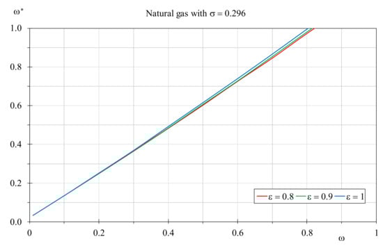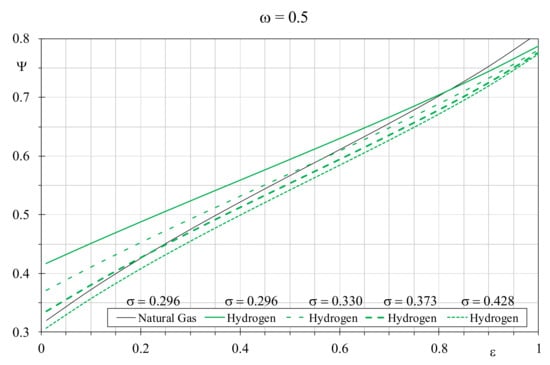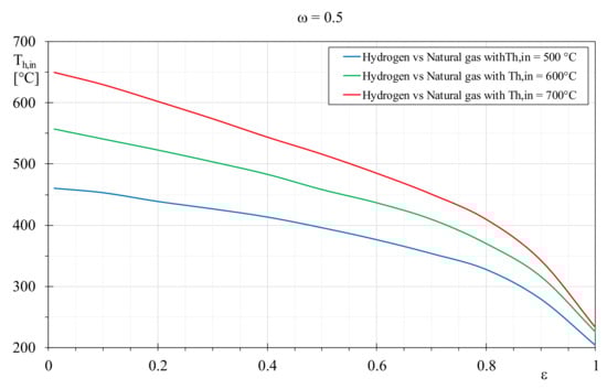 Indicating with ω* the adjusted thermal capacity ratio for hydrogen, Figure 13 shows its trend against the ω values determined for boilers supplied by natural gas by setting σ = 0.296, for three different values of the heat exchanger efficiency. Obviously, these trends are located over the graph bisector to highlight that an augment of the thermal capacity ratio is required for every considered case to fill the gap between hydrogen and natural gas EQIs. It is interesting to note that the trend is almost linear and is slightly affected by the heat exchanger efficiency. However, a hot fluid mass flow rate increase is requested mainly for limited value of the heat exchanger efficiency, and in the majority of the cases a percentage augment ranging between 120% and 130% is necessary. Nevertheless, this condition can be achieved with efficiency values up to 0.8, because over this threshold value the required mass flow rate increment makes the hot fluid with the highest thermal capacity ratio, invalidating the EGN determined by Equation (15).