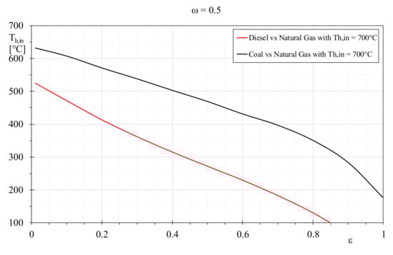 Coal and Diesel flue gas temperatures required to achieve the same EQI of Natural gas with combustion products temperature of 700 °C, related to the heat exchanger efficiency and by setting ω = 0.5.