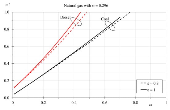 Required thermal capacity ratio (ω*) to attain for diesel and coal the same EQI of natural gas that supplies boiler operating with ω and a dimensionless temperature factor of 0.296, for two different heat exchanger efficiencies.