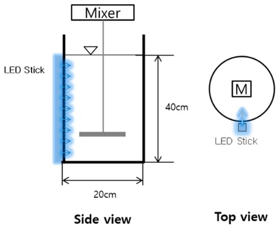 The experiment was conducted using two PBRs. Each reactor was made of an acrylic cylinder with an internal diameter of 20 cm, height of 50 cm, and total volume of 16.0 L and mechanically agitated using an impeller speed at 200 rpm (Figure 2). One PBR was filled with moving media made of polyurethane (15 mm × 15 mm × 15 mm) (MBPBR), and the other PBR was not filled with moving media (SPBR). Both the MBPBR and SPBR with working volumes of 12.5 L were illuminated by an LED with white light. For the light intensity of 500 μmol·m−2·s−1, one LED stick was placed at one side of both reactors. In the MBPBR, a moving medium with a specific gravity of 0.04, specific surface area of 4000 m2·m−3, and porosity of 95% was filled with a 5% packing fraction.
