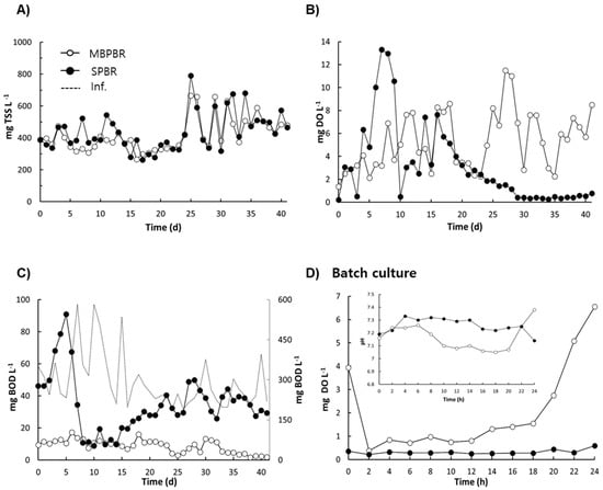 Daily variation in the effluent concentrations of suspended-growth biomass (A), dissolved oxygen (DO) (B), and biological oxygen demand (BOD) (C) from photobioreactors (PBRs) for the operating days. Temporal variation in the effluent concentration of DO and pH from PBRs for 24 h (D). MBPBR and SPBR represent the PBR with a moving bed and the PBR without a moving bed at light intensities of 500 μmol·m−2·s−1, respectively. Both the MBPBR and SPBR were operated with a hydraulic retention time of 4 d. Measurements were conducted in triplicate and the mean values of the triplicates were plotted. Total Suspended Solid (TSS).