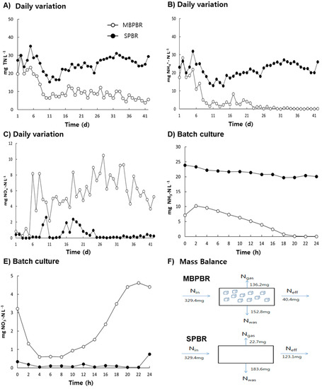 Daily variation in the effluent concentrations of total nitrogen (TN) (A), ammoniacal nitrogen (NH3-N) (B), and NOx−-N (sum of NO2−-N and NO3−-N) (C) from the photobioreactors (PBRs) during the operating days. Temporal variation in the effluent concentrations of NH3-N (D) and NOx−-N (E). Mass balance of nitrogen in the PBR with a moving bed (MBPBR) and PBR without a moving bed (SPBR) during the operating days (F). Measurements were conducted in triplicate and the mean values of the triplicates were plotted.