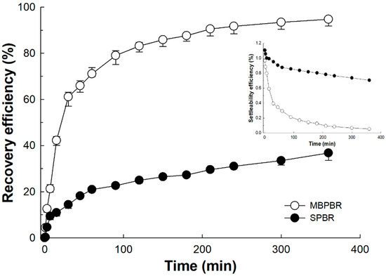 Settling effect of biomass from the photobioreactor with a moving bed (MBPBR) and the photobioreactor without a moving bed (SPBR). The recovery efficiency was calculated from the settleability efficiency with a continuous optical density of 490 nm for 6 h, as follows. Recovery efficiency (%) = (O.D.t0 − O.D.t)/O.D.t0 × 100, where O.D.t is the optical density at time t and O.D.t0 is the initial optical density at time zero. Measurements were conducted in triplicate and the mean values of the triplicates were plotted.