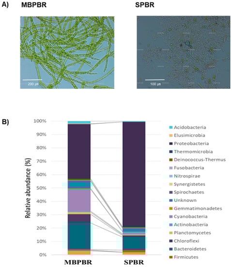 Biofloc of microalgae and other microbes from the photobioreactor with a moving bed (MBPBR) and the photobioreactor without a moving bed (SPBR) (A). Bacterial communities at the phylum level of the algal–bacterial consortia from the MBPBR and SPBR 30 d after operation (B). Phyla with a mean relative abundance greater than 0.01% are shown.