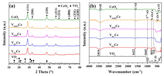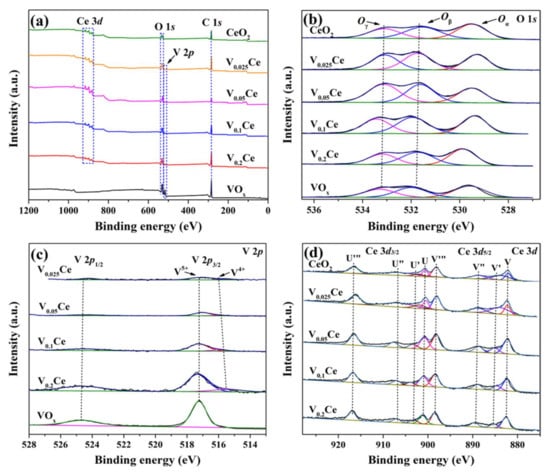 Hollow nanosphere–like VOx/CeO2 materials were prepared via a wetness impregnation approach. Typically, 3.0 g of the above–prepared CeO2 was dispersed into 150 mL of deionized water, and an appropriate amount of NH4VO3 with the molar ratio of nNH4VO3:nCeO2 = 0.025:1, 0.05:1, 0.1:1, or 0.2:1 was then mixed in the above solution. Subsequently, the corresponding molar amount of oxalic acid with the molar ratio of nNH4VO3:noxalic acid = 1:2 was added to the suspension of CeO2. After that, the solution was vigorously stirred at 80 °C until excess deionized water was completely evaporated. The final products were treated under the same conditions as for CeO2 preparation. The obtained materials were designated as V0.025Ce, V0.05Ce, V0.1Ce, and V0.2Ce, respectively.