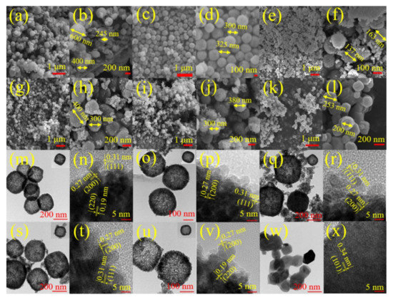FE-SEM images of prepared catalysts are shown in Figure 2a–x. CeO2 exhibited a regular nanosphere–like morphology with different diameters (ca. 245–600 nm), as displayed in Figure 2a,b. The V0.05Ce catalyst was made up of nanospheres with a diameter of ca. 100–200 nm (Figure 2e,f). Compared with the V0.05Ce catalyst, V0.025Ce (Figure 2c,d), V0.1Ce (Figure 2g,h) and V0.2Ce catalysts (Figure 2i,j) consisted of larger nanosphere–like particles with a diameter of ca. 300–400 nm. Moreover, VOx showed an irregular nanosphere–like morphology with size varying from ca. 200 to 300 nm (Figure 2k,l). Figure 2m–x and Figure S2 (Supplementary Materials) exhibit the transmission electron microscope (TEM) and high-angle annular dark-field imaging in scanning transmission electron microscopy (HAADF–STEM) images of prepared catalysts. It was revealed that CeO2 and VOx/CeO2 catalysts possessed a well–defined hollow nanosphere–like structure with diameter in the range of ca. 200–400 nm, in agreement with the FE–SEM results. The results exhibited that VOx species were highly dispersed and did not change CeO2 morphology [28]. VOx had an irregular nanosphere–like morphology with a lattice spacing of 0.34 nm, ascribed to the (101) plane of V2O5 (Figure 2w,x) [29]. The measured lattice distances of 0.31, 0.27, and 0.19 nm were ascribed to the (111), (200), and (220) lattice planes of CeO2 nanospheres (JCPDS #34–0394), respectively (Figure 2n). Figure 2p,r,t and Figure S2 (Supplementary Materials) show that V0.025Ce, V0.05Ce, V0.1Ce, and CeO2–C catalysts possessed the (200) and (111) lattice planes of CeO2 with lattice spacings of 0.27 and 0.31 nm, respectively. For V0.2Ce, the lattice spacings of 0.27 and 0.19 nm were associated with the (200) and (220) crystal planes of CeO2, respectively (Figure 2v). No VOx species on the VOx/CeO2 catalysts could be detected in HAADF–STEM images (Figure 2p,r,t,v), which could be attributed to the rough surface of CeO2 or the generation of VOx films from the layer structure [15].