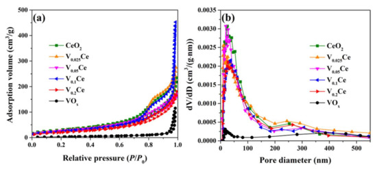 N2 adsorption/desorption isotherms of the prepared materials are presented in Figure 3. CeO2 and VOx/CeO2 catalysts showed a type II isotherm curve with H3–type hysteresis loops at the relative pressure (P/P0) range of 0.7–1.0 (Figure 3a), indicating that meso- and macropore structures co–existed in CeO2 and VOx/CeO2 catalysts [30,31]. VOx exhibited a type III isotherm curve with H3–type hysteresis loops (P/P0 = 0.9–1.0), illustrating that the presence of textural pores facilitated the filling of interparticle spaces. It was demonstrated that the pore size distribution of prepared catalysts was centered at approximately 25.4, 11.7, 19.4, 37.6, 27.0, and 17.4 nm, respectively (Figure 3b), indicating that all catalysts possessed a large number of mesopores. The pore size distribution of materials in the 100–500 nm region could be attributed to the existence of a macroporous structure. The specific surface area, average pore diameter, and pore volume of materials are documented in Table 1, and the average pore diameter followed the order of VOx (63.1 nm) > V0.1Ce (30.1 nm) > V0.025Ce (18.0 nm) > V0.2Ce (14.8 nm) > CeO2 (13.2 nm) > V0.05Ce (10.7 nm). The specific surface area of CeO2 and VOx/CeO2 was much higher than that of VOx, which obeyed the sequence of CeO2 (110.9 m2·g−1) > V0.025Ce (101.0 m2·g−1) > V0.05Ce (98.6 m2·g−1) > V0.1Ce (93.4 m2·g−1) > V0.2Ce (76.1 m2·g−1) >> VOx (11.3 m2·g−1). It was revealed that the specific surface area of VOx/CeO2 catalysts decreased along with the increase in VOx loading because of the partial blockage of CeO2poresby VOx species [28].