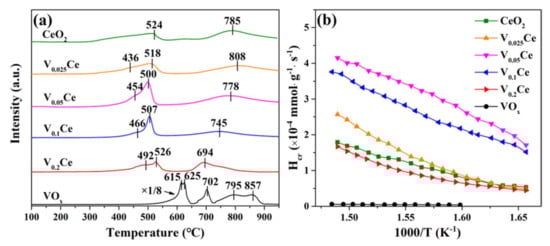 An H2–TPR experiment was employed to test the redox properties of all samples, as depicted in Figure 5a. For CeO2, the reduction peaks presented at ca. 524 and 785 °C were respectively associated with the reduction of surface Ce4+ to Ce3+ and bulk CeO2 [28]. The introduction of VOx could effectively enhance the redox capacity of CeO2. For VOx/CeO2 catalysts, the reduction peaks located at 518, 500, 507, and 526 °C were indexed to the reduction of VOx species (V5+→V4+), while the peaks at 436, 454, 466, and 492 °C were indexed to the reduction of surface CeO2 (Ce4+→Ce3+) [22,28], indicating the co–existence of Ce4+/Ce3+ and V5+/V4+ species, in accordance with the XPS results (Figure 4). It is illustrated that the reduction temperature of VOx species in VOx/CeO2 (except V0.025Ce) catalysts apparently shifted to higher temperatures along with the increase in VOx loading due to theCeO2 interaction with VOx species affecting the redox performance of surface CeO2 [22]. The total H2 consumption of prepared materials below 600 °C followed the order of V0.05Ce (9.86 mmol·g−1) > V0.1Ce (9.53 mmol·g−1) > V0.025Ce (8.64 mmol·g−1) >CeO2 (8.02 mmol·g−1) > V0.2Ce (7.63 mmol·g−1), suggesting that V0.05Ce possessed superior reducibility (Table 3). Additionally, the initial H2 consumption (less than 25% H2 consumption for the first reduction peak) rate was also employed to evaluate the low-temperature reducibility of all catalysts [24]. Figure 5b shows that the initial H2 consumption rates of the catalysts followed the sequence of V0.05Ce > V0.1Ce > V0.025Ce > CeO2> V0.2Ce, suggesting that V0.05Ce had superior low-temperature reducibility.