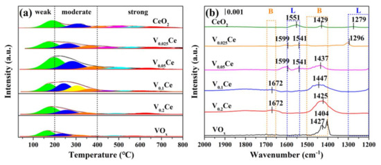 An NH3–IR analysis of prepared catalysts was further conducted to characterize the acid site types, as shown in Figure 7b. Generally, the bands in the regions of 1500–1400 and 1690–1660 cm−1 were associated with the symmetric and antisymmetric stretching vibrations of NH4+ species adsorbed on Brønsted acid (designed as B) sites [40,41]. The bands at 1300–1200 and 1600–1540 cm−1 were related to the symmetric and antisymmetric stretching vibration of NH3 adsorbed on Lewis acid (designed as L) sites [30,40]. For CeO2, the band located at 1429 cm−1 was related to the B acid sites, and the bands centered at 1279 and 1551 cm−1 could be connected to the L acid sites. The bands at 1296, 1541, and 1599 cm−1 associated with L acid sites over V0.025Ce could be detected. For V0.05Ce, the band located at 1437 cm−1 corresponded to the B acid sites, while the bands centered at 1541 and 1599 cm−1 corresponded to the L acid sites. Compared with CeO2, more B and L acid sites could be observed over V0.05Ce. For V0.1Ce and V0.2Ce, the bands at 1404, 1427, and 1672 cm−1 could be ascribed to the B acid sites. However, no L acid sites could be detected over V0.1Ce and V0.2Ce catalysts, indicating that more L acid sites were occupied with the increase in V loading [30]. The bands at 1404 and 1427 cm−1 over VOx corresponded to the B acid sites.