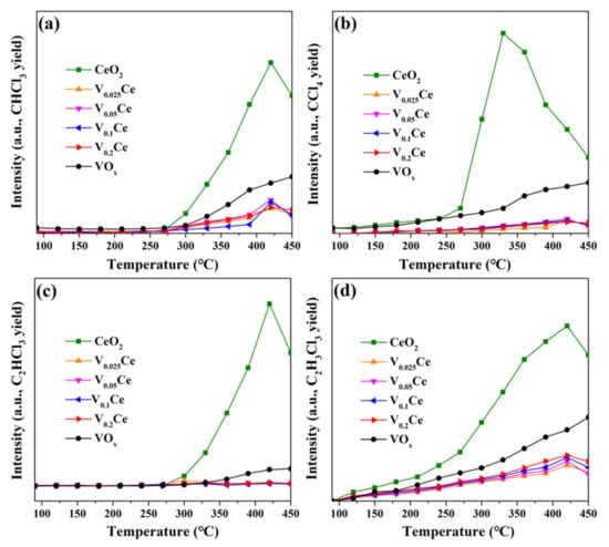 The yields of CO and CO2 as a function of temperature were analyzed in Figure 8b,c. It was revealed that the yields of CO and CO2 over CeO2 and CeO2–C catalysts increased with increasing temperature; however, much different behaviors could be found over VOx/CeO2. The yields of CO and CO2 over CeO2 only had a tiny gap and could reach approximately 50% at 450 °C, whereas the yields of CO (46%) and CO2 (35%) over CeO2–C were lower than that of hollow nanosphere–like CeO2. It could be found that the yield of CO significantly increased when VOx species were loaded on the surface of CeO2. In addition, the yields of CO and CO2 over V0.025Ce, V0.1Ce, and V0.2Ce catalysts increased with increasing temperature. However, the yield of CO over V0.05Ce catalyst initially increased and then decreased with increasing temperature, attributed to the further oxidation of CO (>360 °C). It was reported that the final product mainly containing carbon species is CO over VOx/CeO2 catalysts during 1,2–DCE destruction, and the high yield of CO is presumed to be connected to the surface lattice oxygen of VOx [15].