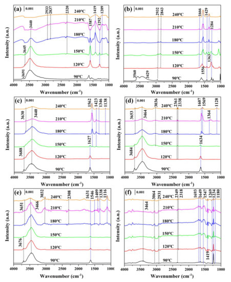 The bands presented at 2932–2933 and 2837–2843 cm−1 attributed to the asymmetric and symmetric stretching of methyl (CH3–) could be observed over CeO2 and V0.025Ce, respectively, which was attributed to the generation of CH3CHO and CH3COOH intermediates during the 1,2–DCE oxidation process [45]. On the other hand, no bands could be detected over the V0.05Ce catalyst in the above wavenumber range. The weak bands located at 3036–3032 cm−1 were detected over V0.1Ce (>150 °C) and V0.2Ce (>180 °C) catalysts, which corresponded with the asymmetric stretching of methylene species (–CH2–) [15,45]. VOx exhibited two weak bands at 3064 and 2931 cm−1 corresponding to antisymmetric stretching of methylene species and antisymmetric stretching of methyl (CH2–), respectively [45]. Generally, the vibration of –CH– stretching (v(CH), such as CH2– and CH3– groups) is related to the adsorption of 1,2–DCE on the catalyst surface [46]. The bands present between 2400 and 2300 cm−1 were associated withCO2 adsorption, while the bands located in the 2300–2000 cm−1 region were indexed to CO adsorption [15,43]. As shown in Figure 10b,c, no bands corresponding to adsorbed CO2 were detected over V0.025Ce and V0.05Ce catalysts, and the bands corresponding to adsorbed CO could not be observed in all catalysts. The bands at 1700–1200 cm−1 could be classified as the vibration of surface formates, carbonate species, and hydrocarbons, which were associated with the formation of CO2 and CO during 1,2–DCE oxidation [24].