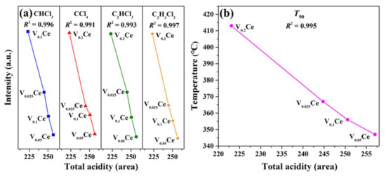 Figure 9 reveals that the yields of chlorinated byproducts (CHCl3, CCl4, C2HCl3, and C2H3Cl3) over VOx/CeO2 were significantly lower than those of CeO2 and VOx during the 1,2–DCE oxidation process, ascribed to the high surface Cl removal ability of composite catalysts. Feng et al. [24] reported that the CoCrOx catalyst can effectively inhibit the yield of chlorinated byproducts during 1,2–DCE destruction, and it possesses better product selectivity than Cr2O3 and Co3O4 due to the abundant B and L acid sites and higher acid strength. Therefore, the relationship between chlorinated byproducts yield and total acidity over VOx/CeO2 catalysts was analyzed. As shown in Figure 12a, CHCl3, CCl4, C2HCl3, and C2H3Cl3 yields versus total acidity maintained linear relationships (R2 = 0.996, 0.991, 0.993, and 0.997, respectively). Compared with V0.025Ce, V0.1Ce, and V0.2Ce catalysts, V0.05Ce possessed higher total acidity and lower chlorinated byproduct (CHCl3, CCl4, C2HCl3, and C2H3Cl3) yields, indicating that the yields of chlorinated byproducts decreased with increasing total acidity, which apparently reduced the occurrence of the chlorination reaction [53]. In addition, the catalytic activity of VOx/CeO2 catalysts (T90) versus total acidity maintained a good linear relationship (R2 = 0.995), as shown in Figure 12b. The above results indicate that the total acidity of catalysts played a vital role in inhibiting the production of chlorinated byproducts. Therefore, it can be reasonably explained that the low chlorinated byproduct yields could be ascribed to the higher total acidity and good synergy between CeO2 and VOx species during the 1,2–DCE oxidation process.