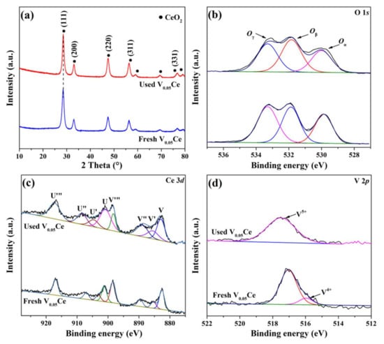 (a) XRD of the used V0.05Ce catalyst; XPS spectra of the used V0.05Ce catalyst: (b) O 1s, (c) Ce 3d, and (d) V 2p.