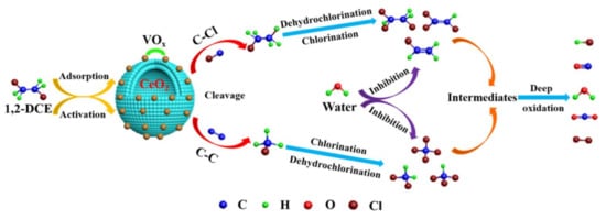 Combining the results of in situ DRIFTS and byproduct distribution (Figure 9 and Figure 10), a destruction mechanism of 1,2–DCE over prepared materials was proposed, as shown in Scheme 1. Generally, the catalytic oxidation of chlorinated alkanes (CA) proceeds according to the procedure of CA adsorption →Cl dissociation →C–C/C–Cl cleavage →Cl desorption/accumulation [49,50]. As such, 1,2–DCE is initially adsorbed on the surface of catalysts, which is mainly ascribed with the adsorption and dissociated of Cl bonds on Lewis acid sites (V5+/4+ and Ce4+/3+) [15]; The C–Cl (Path 1) and C–C (Path 2) bonds in 1,2–DCE are activated and cleaved, forming chloroethane, vinyl chloride, and chloromethane intermediates. Afterward, the polychlorinated byproducts (CHCl3, CCl4, C2HCl3,and C2H3Cl3) are mainly produced via dehydrochlorination and chlorination. Then, the reaction of dissociative Cl from polychlorinated byproducts and surface hydroxy groups can form HCl, and HCl would be partially oxidized to form Cl2 (the Deacon reaction) [15,49]. Additionally, the intermediate acetaldehyde (from the activation of the C–H bond and the transformation of hydrogen species on VOx species [15]) would be easily and rapidly oxidized to oxygenate species (carbonate bidentate) and partially oxidized to maleates, acetates, formates, and so on, which are usually considered the main source for the generation of CO and CO2 [24,51]. The above oxygenate species are further oxidized to form the final products (CO, CO2, Cl2, and HCl).