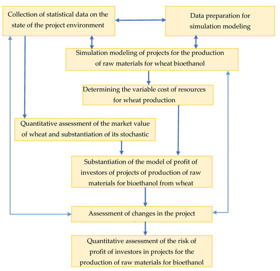Currently, the world’s energy resources occupy a significant share in the cost of production of certain products and provision of services [,,,]. To make them cheaper, each of the countries of the world implements its own projects to replace traditional fuels with alternative types depending on the available natural resources. Ukraine has a significant natural potential of fertile soils, which provides the production of biological raw materials for bioethanol [,,,,]. In particular, one of the raw materials for the production of bioethanol in Ukraine is wheat. At the same time, investor’s profit in projects for the production of raw materials for bioethanol is very important for them [,,,]. Investors’ profits depend on the changing project environment, which in turn causes risk. Potential investors in projects for the production of raw materials for wheat bioethanol at the planning stage want to know the risk of predicted profit on investments [,,]. During the determining the effectiveness of investments in projects for the production of raw materials for bioethanol, it is necessary to assess this risk for a given project environment [,,]. Thus, qualitative forecasting of the risk of investment in projects for the production of raw materials for bioethanol is possible on the basis of tools that take into account the stochastic project environment [,,,,,].
