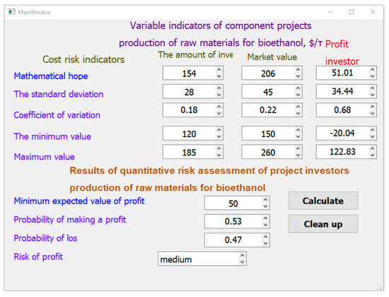 The algorithm of the proposed software is based on the proposed approach (Figure 1). For the operation of the software, first of all, collection of statistical data on the state of the project environment is carried out, which are then processed according to Equations (7)–(11) and entered into the working window. These data include statistics on the market value of raw materials in the region where it is planned to implement a project for the production of agricultural raw materials for bioethanol, as well as the costs incurred for production.