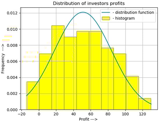Histogram and theoretical curve of profit distribution of investors of projects of production of raw materials for bioethanol from wheat.